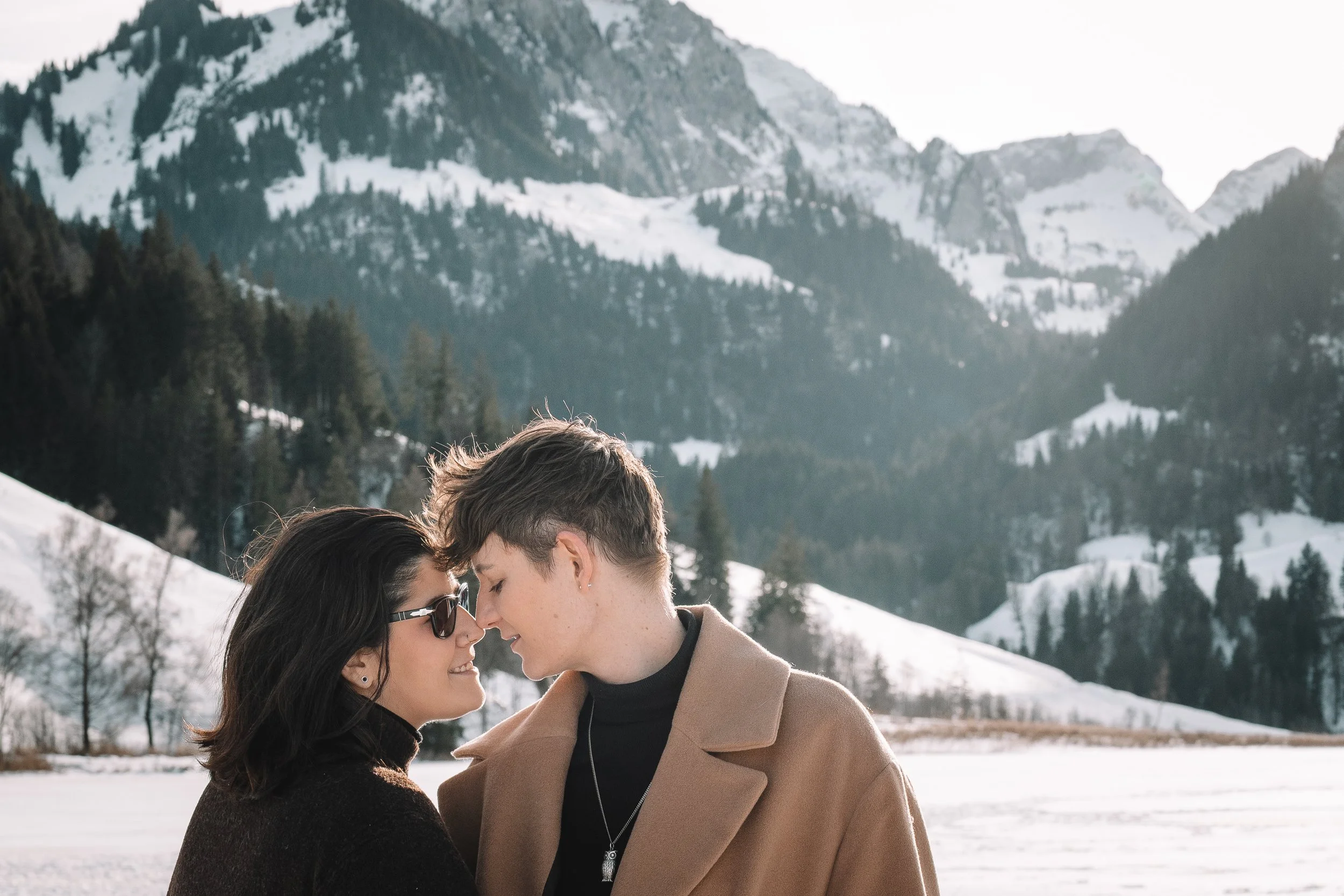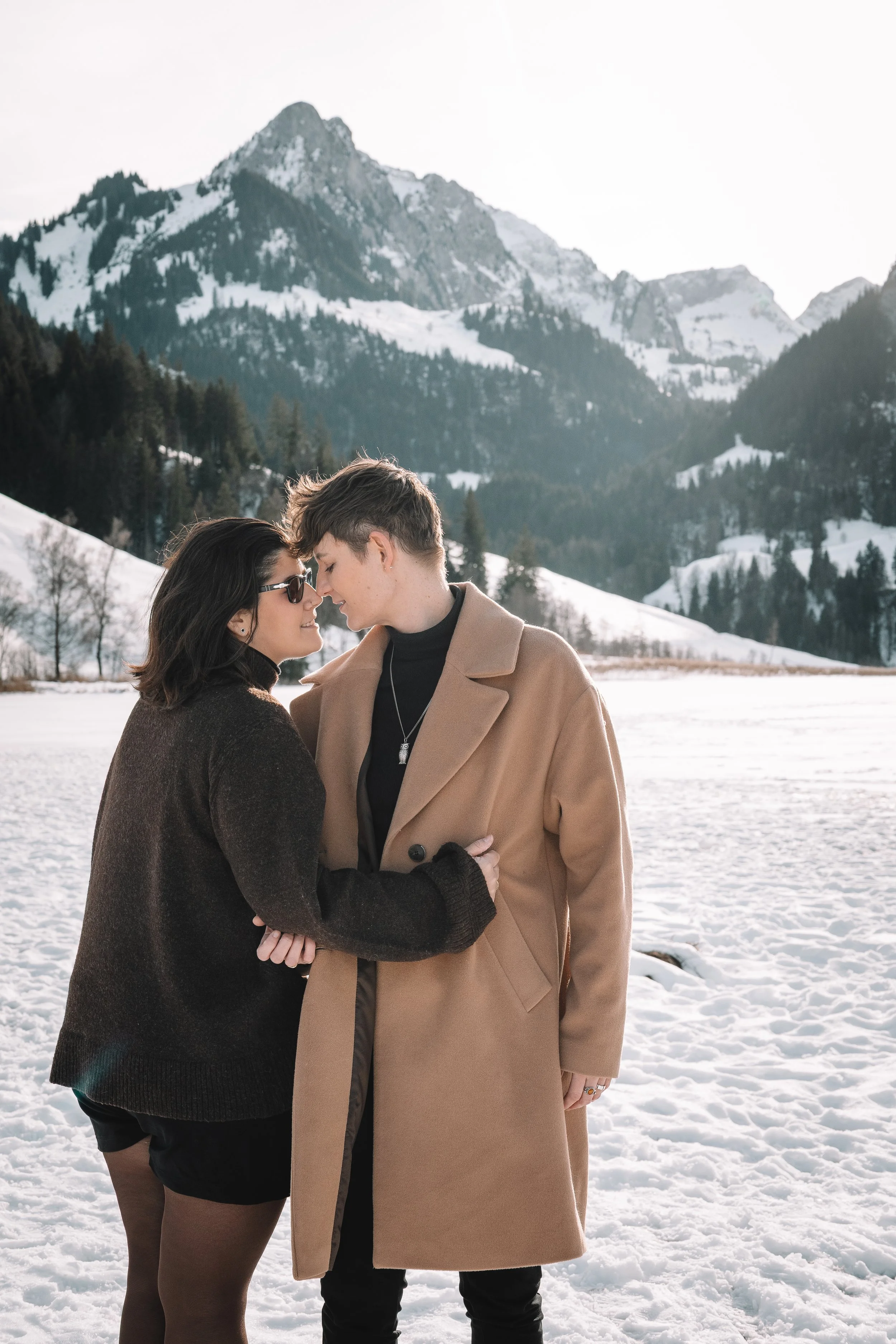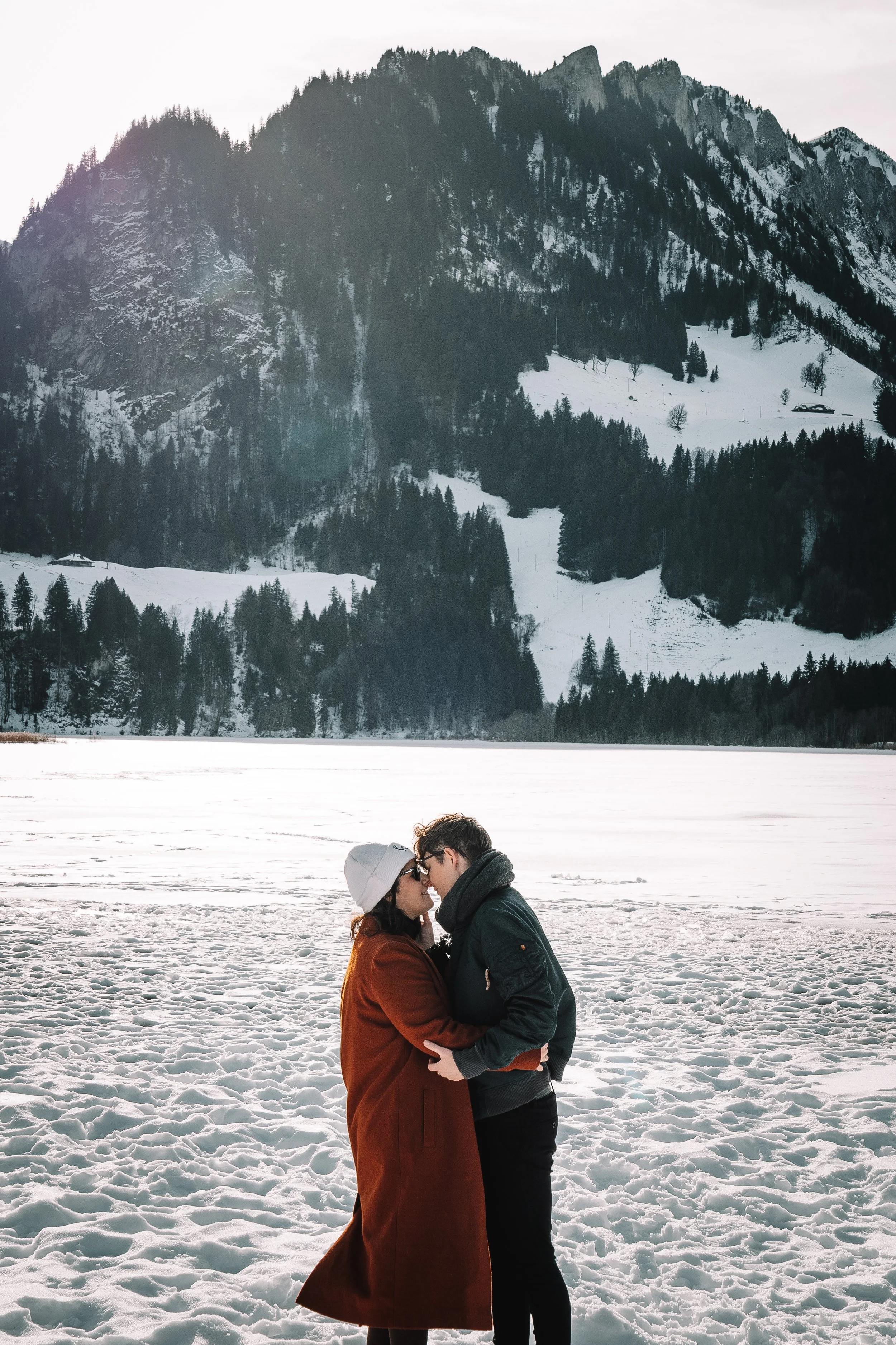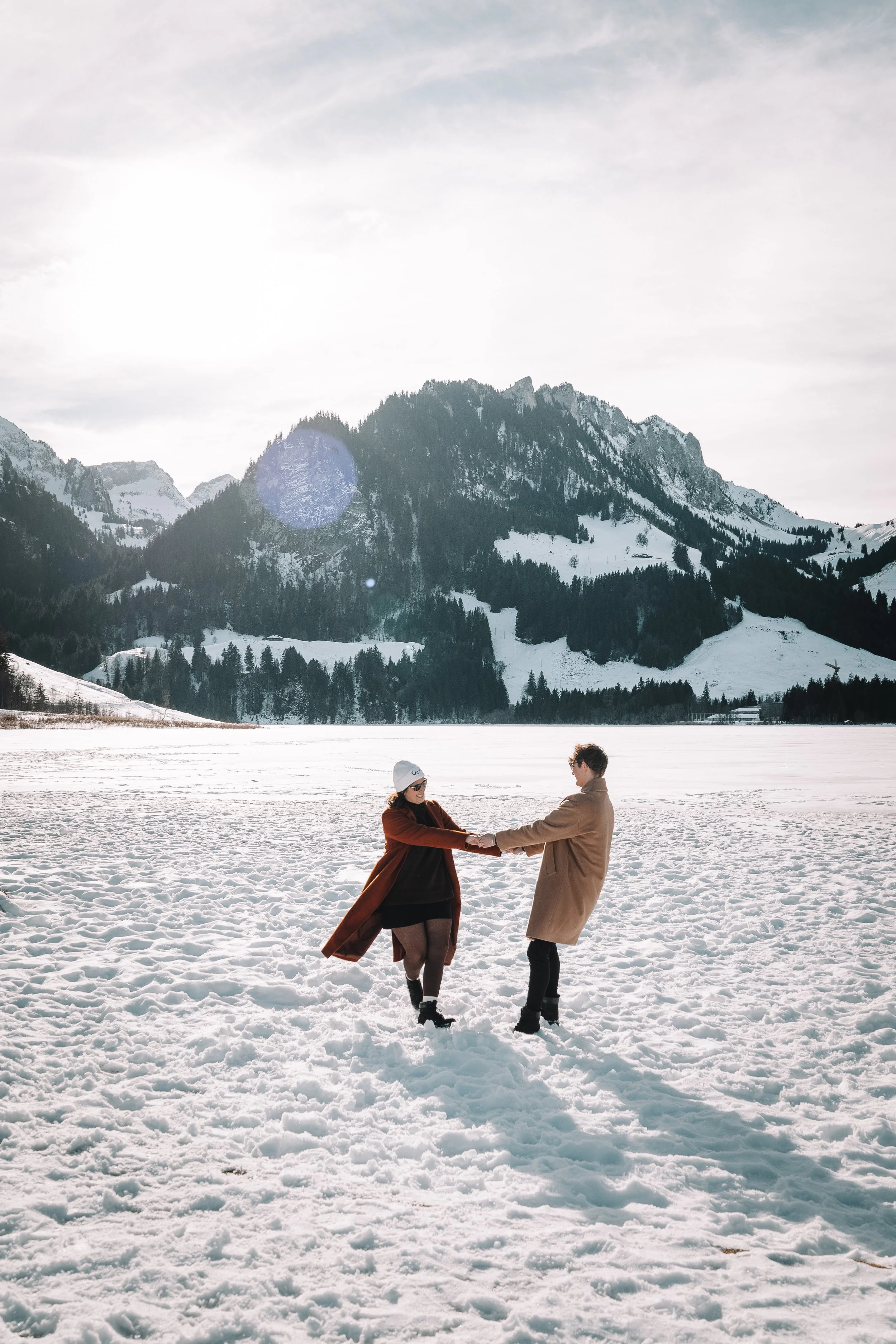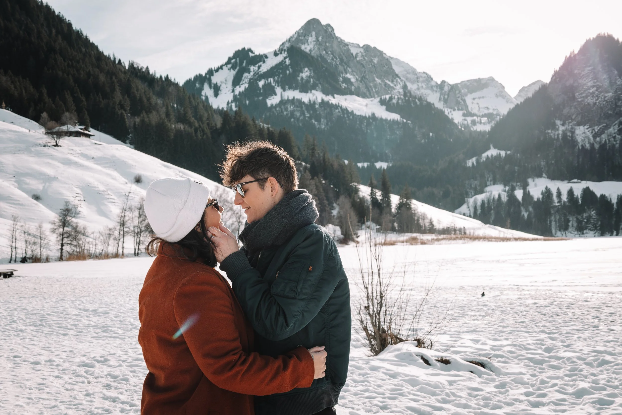 Et on est trop heureuses de te proposer des mini-séances au Lac noir (Schwarzsee), à 30 minutes de Fribourg. Un petit lac au milieu des montagnes enneigées, le soleil qui frappe la neige et la glace. Un décor somptueux et magique! Avec un peu de chance, vous pourrez même louer des patins à glace et vous amusez sur ce beau lac! Mais pas de panique, si ce n’est pas possible, ou que tu préfères pas trop tenter ça, on a plein d’autres idées et accessoires pour enrichir vos séances, c’est important de t’écouter!